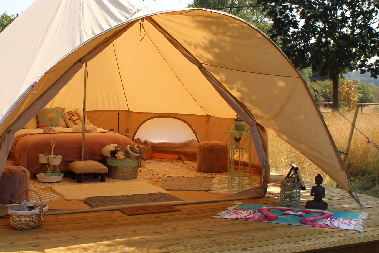 Our small site of 5 spacious bell tents is the perfect spot for a romantic couples retreat, or a relaxed family holiday in this unspoilt village, just 4 miles from the coastal town of Southwold. Nestled between the stunning nature spots of Dunwich, RSPB Minsmere and the Norfolk Broads, you couldn’t be better placed to explore the peaceful Suffolk countryside. Just throw open the doors of your bell tent to enjoy a beautiful view of the rolling fields, right from the comfort of your luxurious double bed and goose down duvet. Click on a bell tent then scroll down to view photos of each one