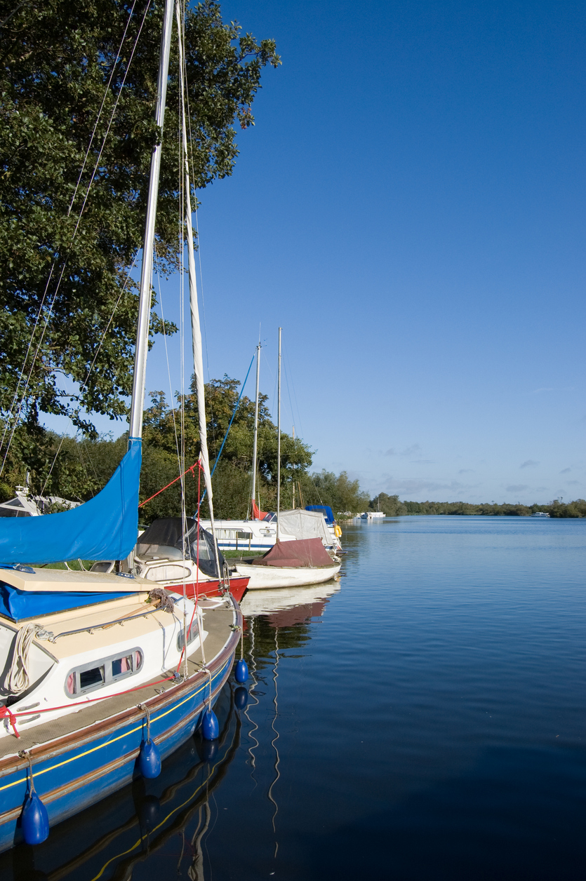 Moored sailing yachts on the Norfolk Broads